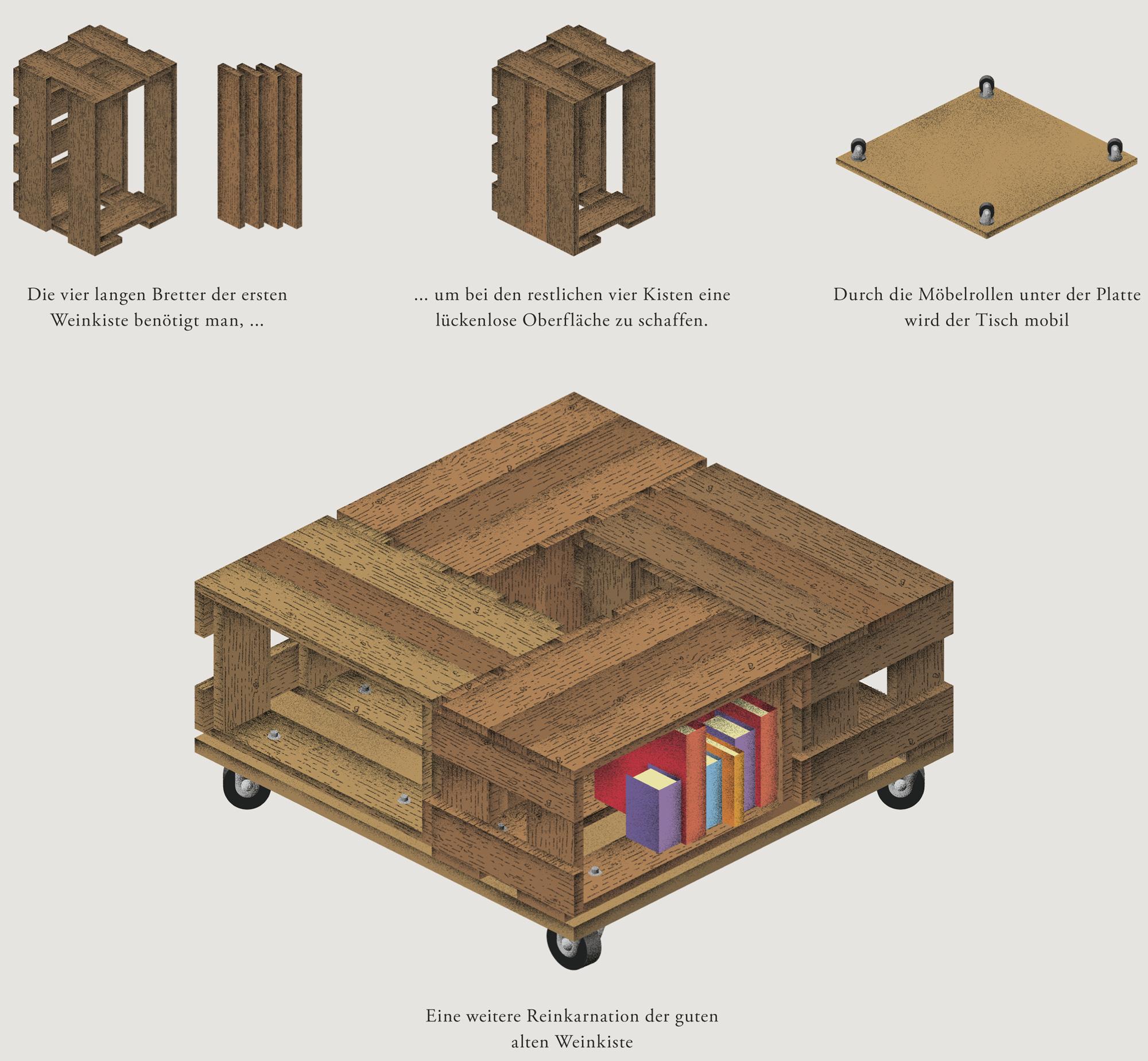 Haben sie die alten fensterläden behalten? Weinkisten tisch selber bauen diy zenideen. Ein couchtisch gibt jedem wohnzimmer den eigentlichen flair. Alle bauanleitungen zum thema couchtisch anzeigen. Anschließend werden die weinkisten seitlich liegend aufgestellt und wie aus der bauanleitung ersichtlich, mit schrauben zusammengeschraubt. Schön, wenn aus den dingen, die nicht mehr gebraucht werden, etwas neues entsteht. Zwei kisten mit dem boden gegeneinander geleimt bilden einen kleinen tisch. Sie dürfen nicht haben in der regel zu investieren viel bargeld und kaufen komplett neu möbel damit sie können erneuern die schau. Denn oft muss man nur die beine anpassen, damit das gleiche möbelstück entweder zum essen oder aber zum kaffeetrinken passend ist. Die weinkisten werden innen und außen, wie schon oben beschrieben, mit einem schwingschleifer geschliffen. Ein obstkisten tisch aus alten apfelkisten, kannst du mit einer diy anleitung auch selber zusammenbauen. Tisch aus weinkisten selber bauen: Die rollen sollten feststellbar sein, damit der.